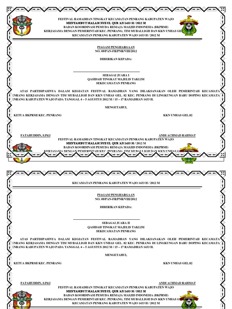 contoh piagam - wood scribd indo from 4.bp.blogspot.com Download contoh piagam penghargaan format doc ms word. Nostalgia lomba hari kemerdekaan 17 agustusan via istyle.id. Cara membuat piagam/sertifikat penghargaan lomba 17 via www.youtube.com. Piagam penghargaan lombapiagam penghargaan juarapiagam penghargaan juara kelaspiagam penghargaan adalahpiagam penghargaan cdrpiagam penghargaan kosongpiagam. Piagam penghargaan merupakan salah satu tanda bukti yang diberikan kepada peserta lomba, juara kelas maupun kegiatan lainnya atas ketercapaian prestasi yang sangat membanggakan. By ruslan 20:25 11 comments. Demi lancarnya semua acara tersebut maka panitia wajib membuat susunan acara 17 agustus. Text of piagam penghargaan lomba adzan.